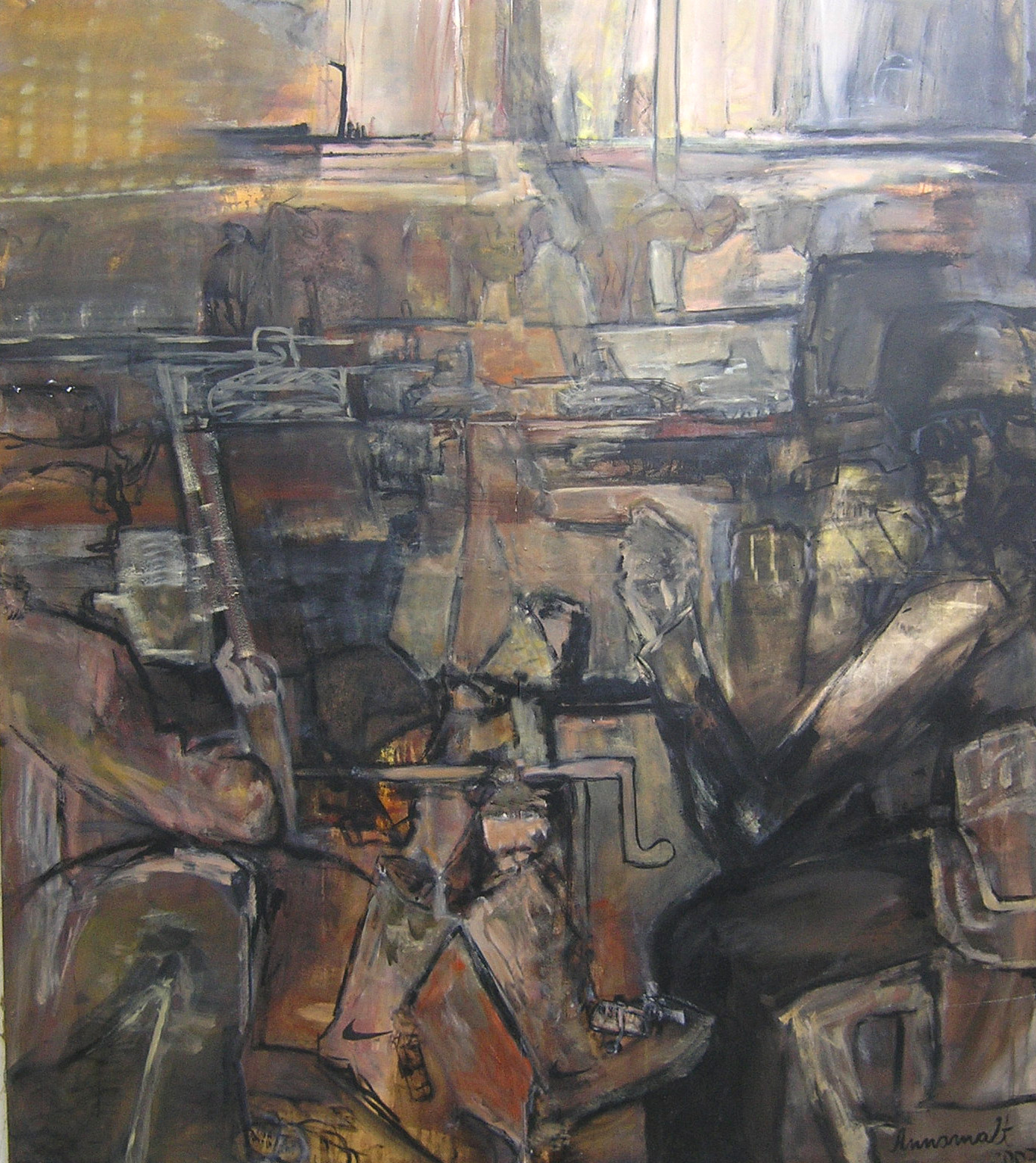 Seit tausenden von Jahren ziehen die Karawanen durch die Wüstenstaaten des Nahen und Mittleren Osten. Die weiten Handelswege brachten den Bewohnern der Staaten einst Reichtum und Wohlstand. Aber ebenso viele Auseinandersetzungen und Kriege beim Kampf um die wertvollen Güter. Auch in unserer Zeit bestimmt die Ware, das Öl, das Schicksal dieser Wüstenregionen. In der hinteren oberen Hälfte des Bildes erkennen wir eine Ölraffinerie mit ihrer typischen Erdgasfackel. Die Fabrik leuchtet, als wäre sie selbst der Sonnenaufgang und wollte den neuen Tag erhellen. Ansonsten scheint der Himmel verdunkelt. Unterhalb der Raffinerie sehen wir die Kamele nach Osten ziehen. Aber auf der gleichen Straße ziehen auch Panzerkolonnen nach Westen. Diese gegensätzliche Bewegung und die unterschiedlichen Transportmittel bedeuten Krieg in diesem Land. Die Panzer bringen nur eine Ware - den Tod. Im Bildvordergrund sehen wir zwei Soldaten am Lagerfeuer. Gibt es eine Kriegspause? Ist es Nacht oder ist der Himmel durch Pulverrauch verdunkelt? Was auf den ersten Blick gemütlich aussieht, kann auch die Ruhe vor dem Sturm sein. Oder ein paar Minuten Erholung zwischen den Gefechten, die man nutzen muß, um seine Stiefel vom Schweiß zu trocknen und sich mit einem Gespräch neuen Mut zu machen. Das Gewehr wird jedoch nicht aus der Hand gelegt und es ist auch keine Zeit, die Uniform auszuziehen. Denn es geht darum die Handelswege zu erobern und den Wohlstand zu sichern.